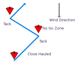 In steering toward the point that he wants to reach, he comes at it at about a 45 degree angle, then he tacks, or turns his boat about 90 degrees in the other direction, and after traveling in that direction for a ways, he tacks again back to his original angle.